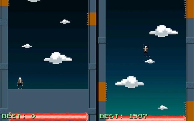 The player leaps between steel beams on either side of the level by tapping the screen. He must avoid the ever-present deadly spikes while getting chased by a devastating laser beam.